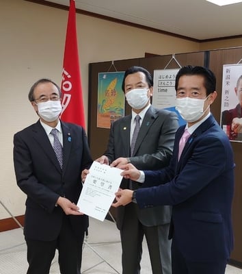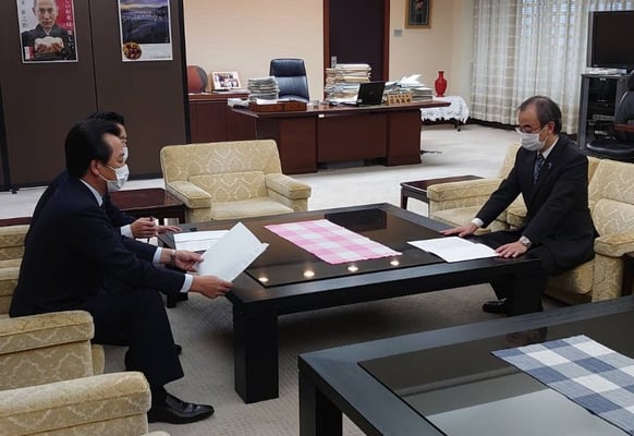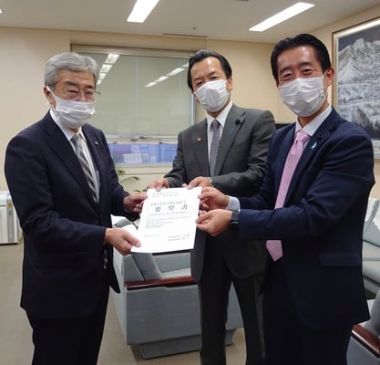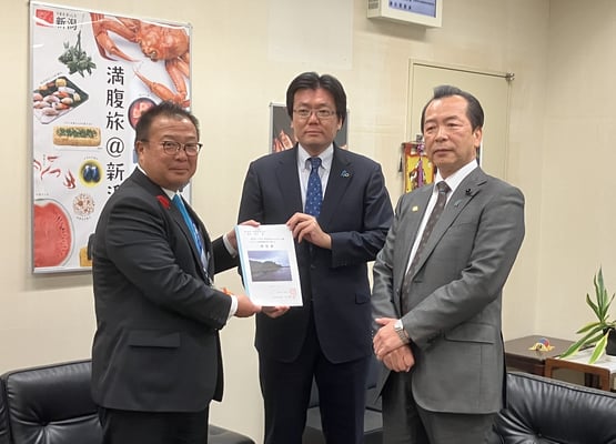 令和6年11月6日、新潟県議会議長室にて新潟県商工会連合会からの要望書を受領。早川連合会長と近田専務理事が来庁。