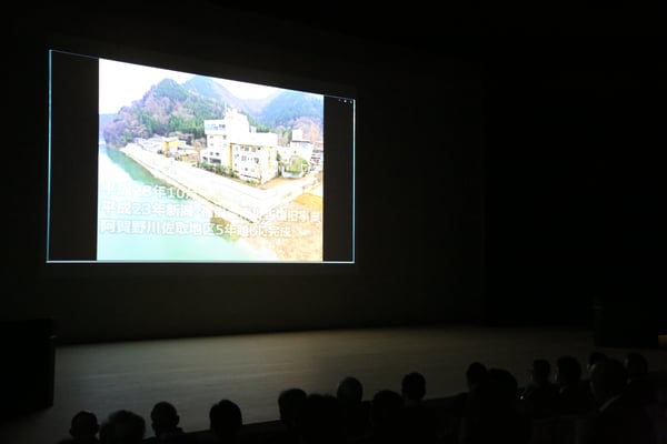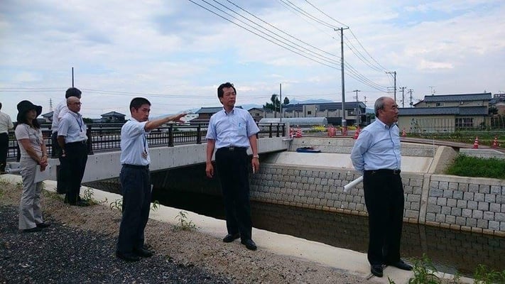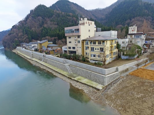 阿賀野川の復旧工事は、五泉市佐取地区内の阿賀野川左岸、延長1,044mで事業費約15億9千万円を投じ、掘削、築堤、護岸工事を行った。特に咲花温泉旅館街に特殊堤擁壁を建設することから川沿いの温泉旅館前を河床等として整備し、賑わいのある河川空間とすることが可能となった。この水辺と親しむ工法は全国的に例のないあらたな先進事例として注目されていることから、今後の咲花温泉の活性化と発展を望む。これまでの温泉組合並びに関係者の皆様のご協力に感謝申し上げます。