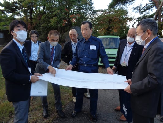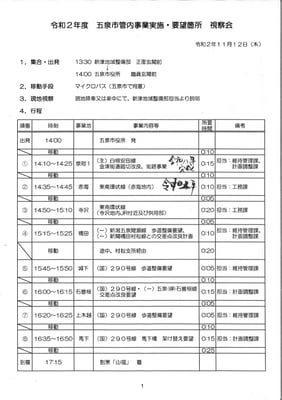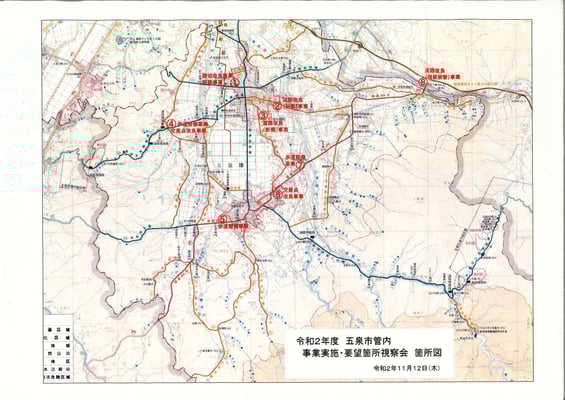 令和2年度も11月12日に、新潟地域振興局新津地域整備部(土木部)の関部長はじめ関係職員と、五泉市長をはじめ都市整備課、上下水道課の職員で、五泉地域の件に対する主要要望箇所の現場視察会を開催し順次現場をまわり、県の状況説明を聴取するとともに要望活動を行った。視察現場先は下記の通り。