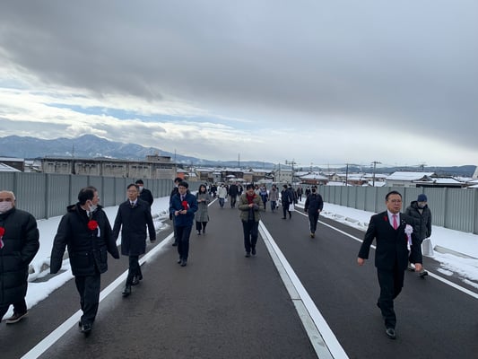 令和6年12月19日、昭和40年に都市計画決定された五泉市東南環状線は、新潟県が県道として建設工事を実施し、本日開通式が開かれた。本事業は南本町三丁目交差点から寺沢を抜け、跨線橋を通って赤海一丁目に至る未整備区間1,469mの県道新設工事である。基本部分の総工費は約41億円。その内国が20億円、県が21億円の負担となった。この道路に関する五泉市の負担はない。