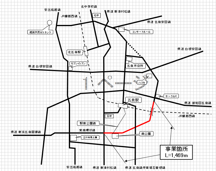 令和6年12月19日、昭和40年に都市計画決定された五泉市東南環状線は、新潟県が県道として建設工事を実施し、本日開通式が開かれた。本事業は南本町三丁目交差点から寺沢を抜け、跨線橋を通って赤海一丁目に至る未整備区間1,469mの県道新設工事である。基本部分の総工費は約41億円。その内国が20億円、県が21億円の負担となった。この道路に関する五泉市の負担はない。