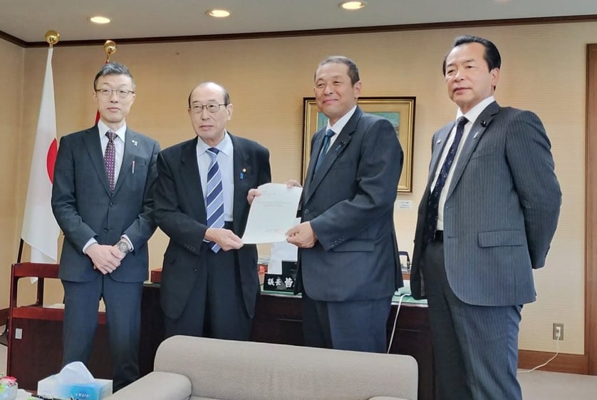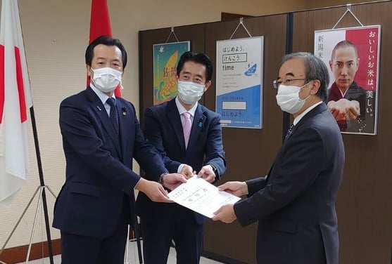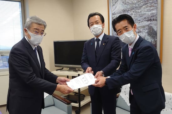 令和6年11月6日、新潟県議会議長室にて新潟県商工会連合会からの要望書を受領。早川連合会長と近田専務理事が来庁。