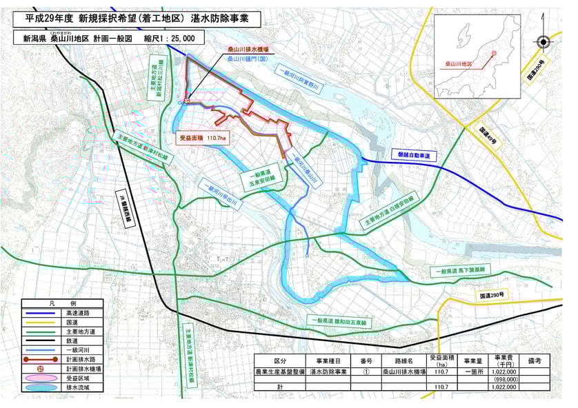 昭和41年に一級河川に指定された桑山川は、巣本地区の大部分を占める785㏊を流域とする。周辺環境の開発や近年の異常気象による豪雨により多大な農地被害が繰り返し発生してきた。阿賀野川、早出川の二大河川洪水時に逆流を防ぐため桑山川流下の門扉が下ろされる。行き場を無くした内水で流域一帯が冠水する。度重なる農作物被害に関係地域住民が被害解消と安全な地域づくりのために流域関係者と共に桑山川排水機場設置促進期成同盟会を結成し要望活動を継続してきた。