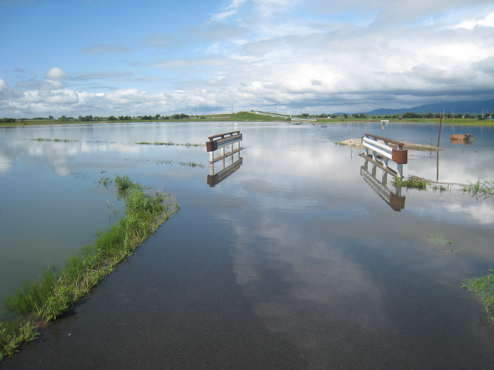 7月31日阿賀野川堤外地の農地被害状況、前日まで冠水していた堤外地も水位がさがり農作物も見えてきたが、大量の土砂やゴミにより、農道や畑が大きな被害を受けた。農作物もほとんどものになりそうもない。農道や農地の復旧作業がこれから大変になる。