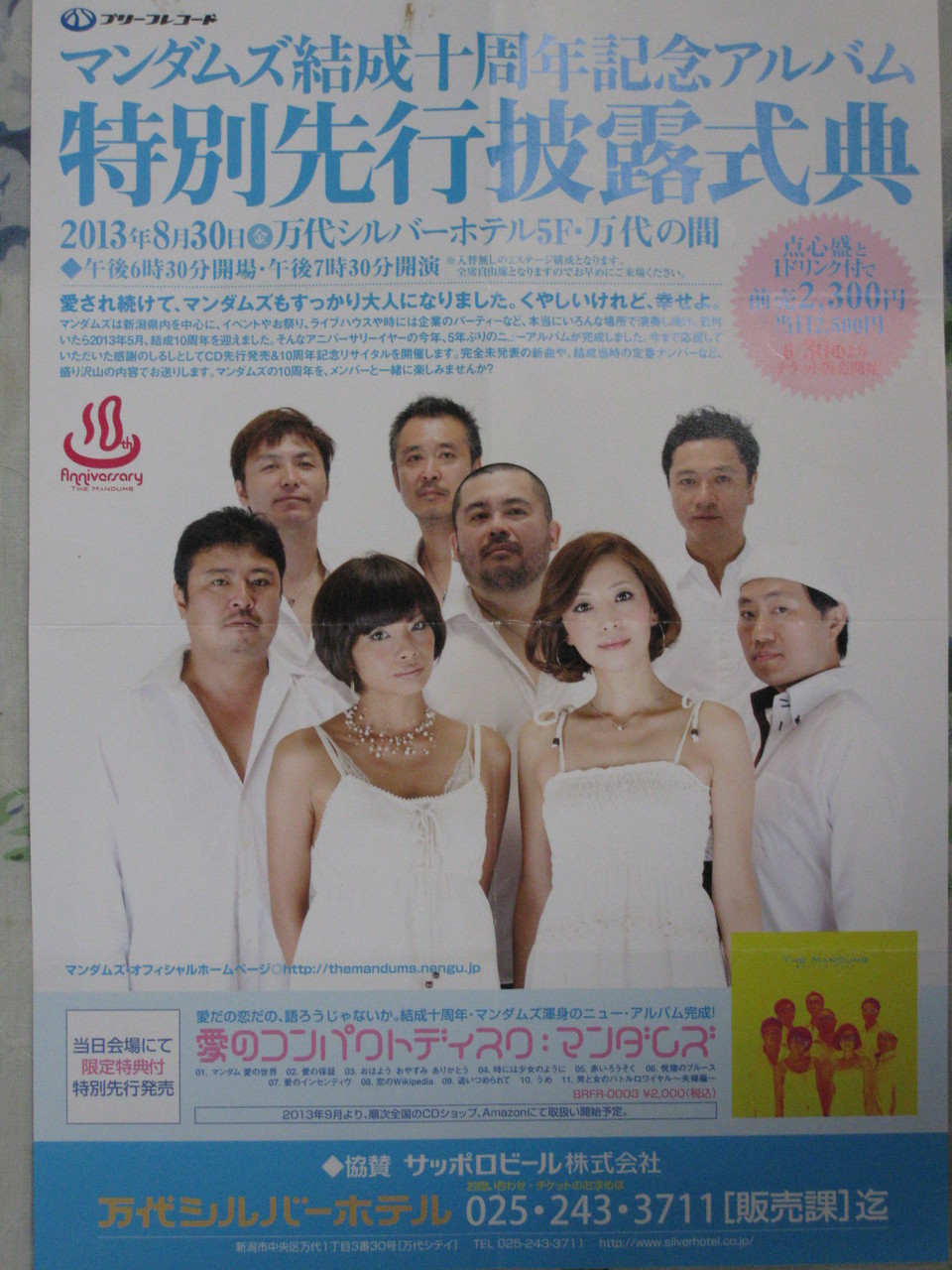 本日、新潟No,1といわれているアマチュアバンド「マンダムズ」の結成10周年記念アルバム特別先行披露式典(コンサート)に出席。シルバーホテルの5階は超満員で盛り上がる一夜となった。...