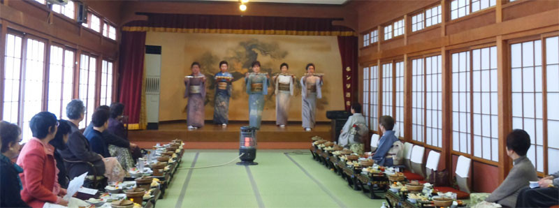 お座敷にお膳。ステージには和服で魅力的な女性の皆様の舞踊。週に2回稽古を重ねているとのこと。こんなにいい思いをさせて頂いていいのだろうか。
