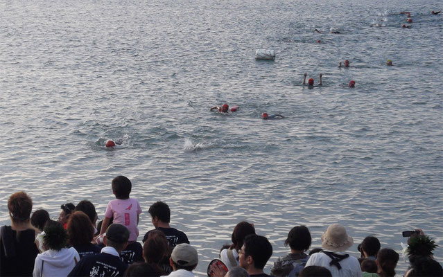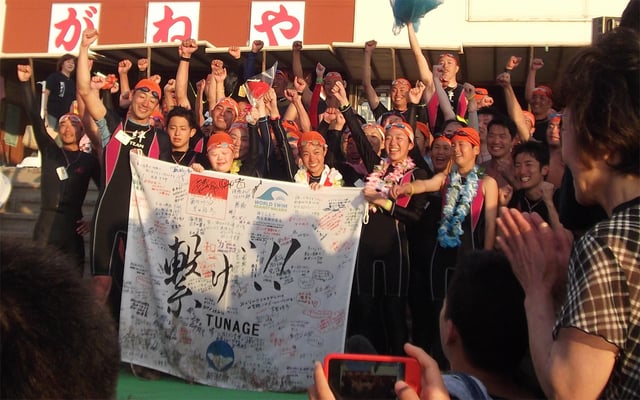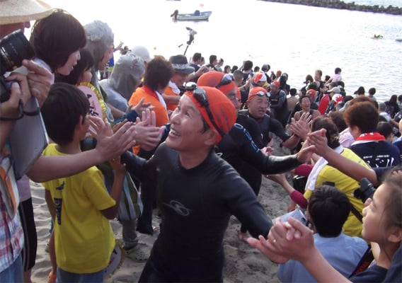 ようやく永い遠泳の最後を締めくくるように一人ひとり浜に到着。大勢の応援者とハイタッチで順次ステージへ。涙の感動がいつまでも、いつまでも。松川会長はじめ五泉JCメンバー・ボランティアの皆様、誠にお疲れ様でした。