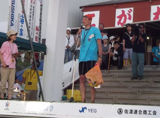 片道40km、往復80kmの新潟-佐渡間を身体に障害を持った皆さんも含めて、リレーで横断。昨年は新潟福島豪雨で中止を余儀なくされた。今回は、リベンジでありファイナルであり、多くのボランティアが支援し、多くの皆さんが到着を待つ。