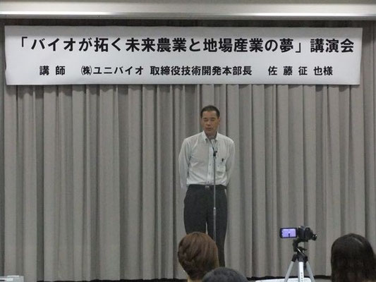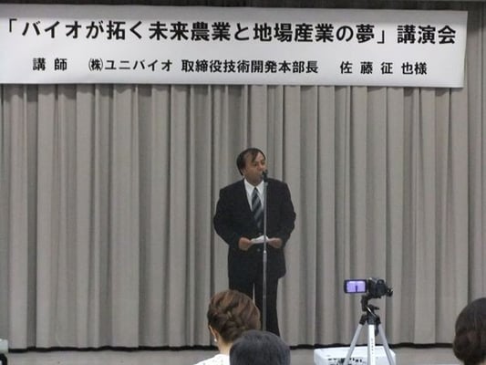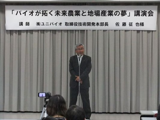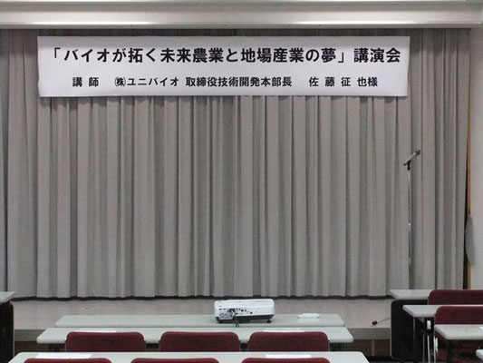 本日、㈱ユニバイオの佐藤征也様より、「バイオが拓く未来農業と地場産業の夢」をテーマに講演会を開催し、多くの参加者より関心をもって勉強して頂いた。