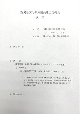 本日は、第五委員会室にて新潟県文化振興議員連盟が開催され出席。講師は市山流宗家7台目 市山七十郎(なそろう)氏
